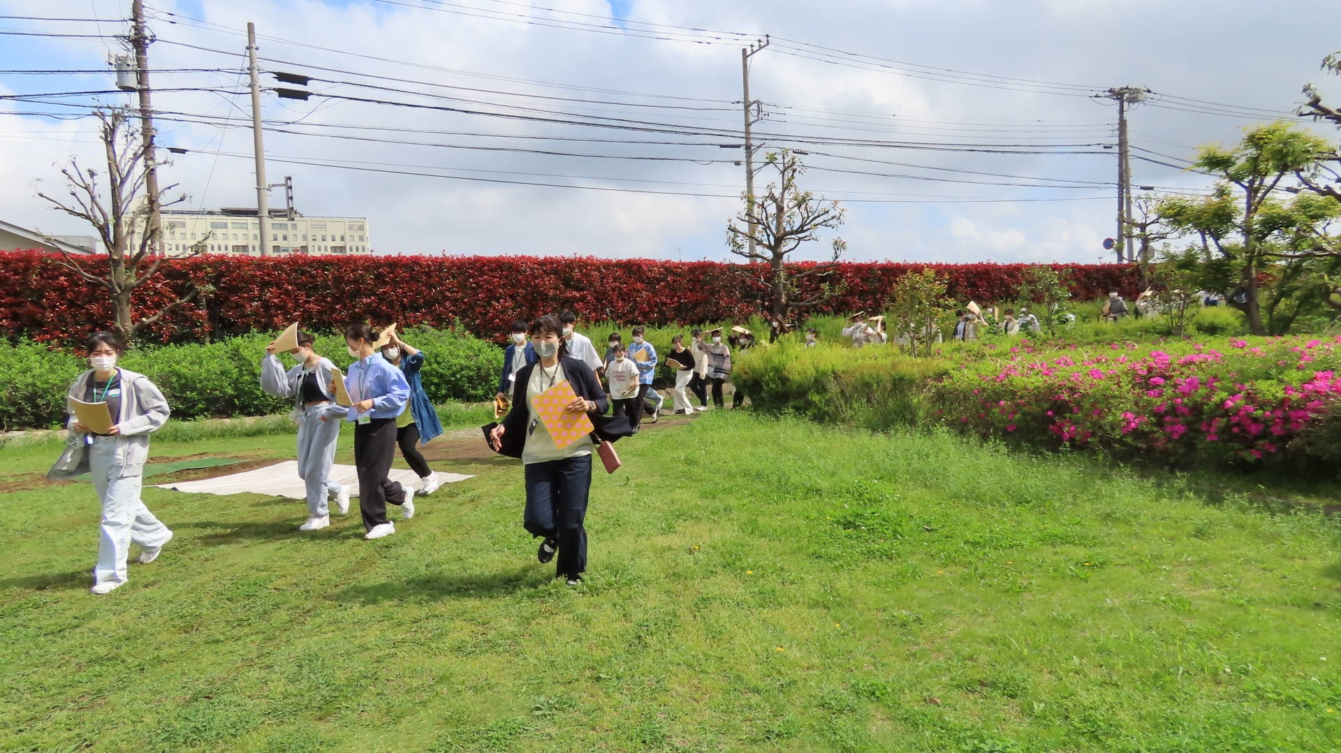 新入生同士の親睦を深めるため、「青葉の森公園で春をみつけに行こう♪」をテーマに隣接している公園へ移動します。クラスを横断したグループに分かれ、テーマに沿った写真撮影を行います。学校に戻るとお気に入りの写真を使ってスライドを作成します。